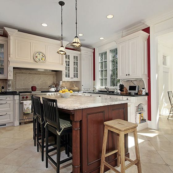 Потолки в комнатах с французским стилем обязательно украшаются деревянными балками или их качественной имитацией. На кухне к ним можно подвешивать сухоцветы, тканевые мешочки с пряными травами или даже кухонную утварь. Чтобы покрыть сам потолок, используется штукатурка или краска белого цвета.